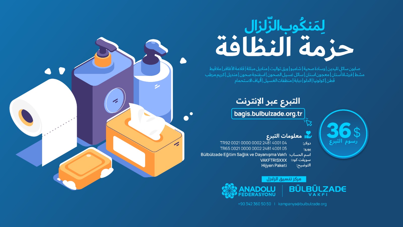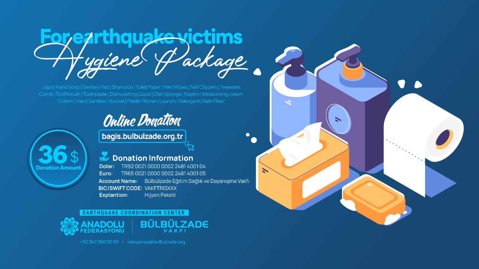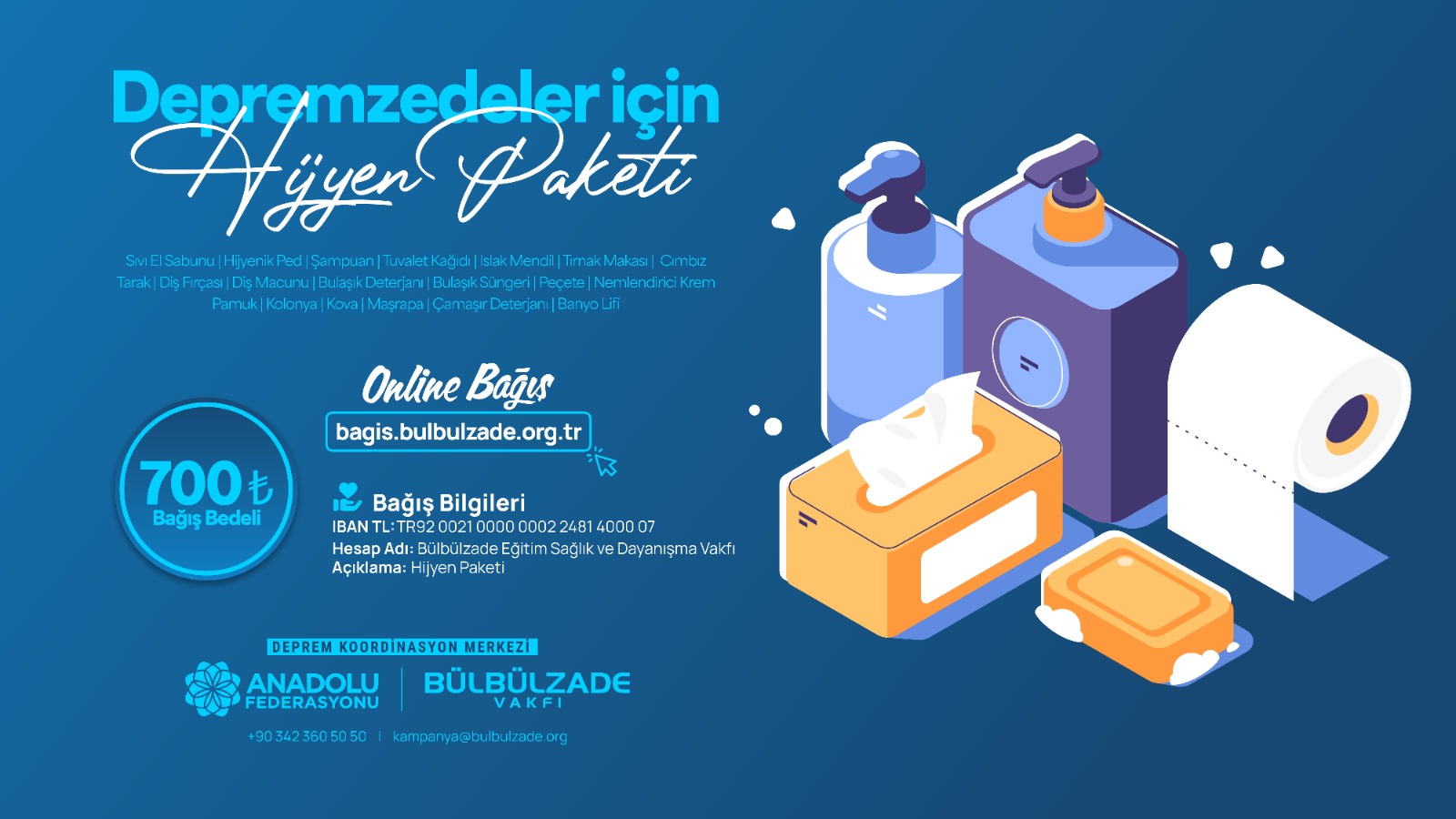 Depremden sonra hijyen ihtiyacının artmasıyla Deprem bölgesinde bulunan vatandaşlara yönelik “Hijyen Paketi” Kampanyamız başladı. Kampanyamız ile vatandaşlara bakım ve kişisel bakım ürünlerinin bulunduğu hijyen paketi gönderilecektir.